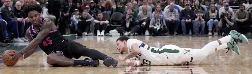 Miami Heat guard Davion Mitchell (45) beats Milwaukee Bucks guard Ryan Rollins (13) to a loose ball during the first half of their game Tuesday, February 24, 2026 at Fiserv Forum in Milwaukee, Wisconsin.