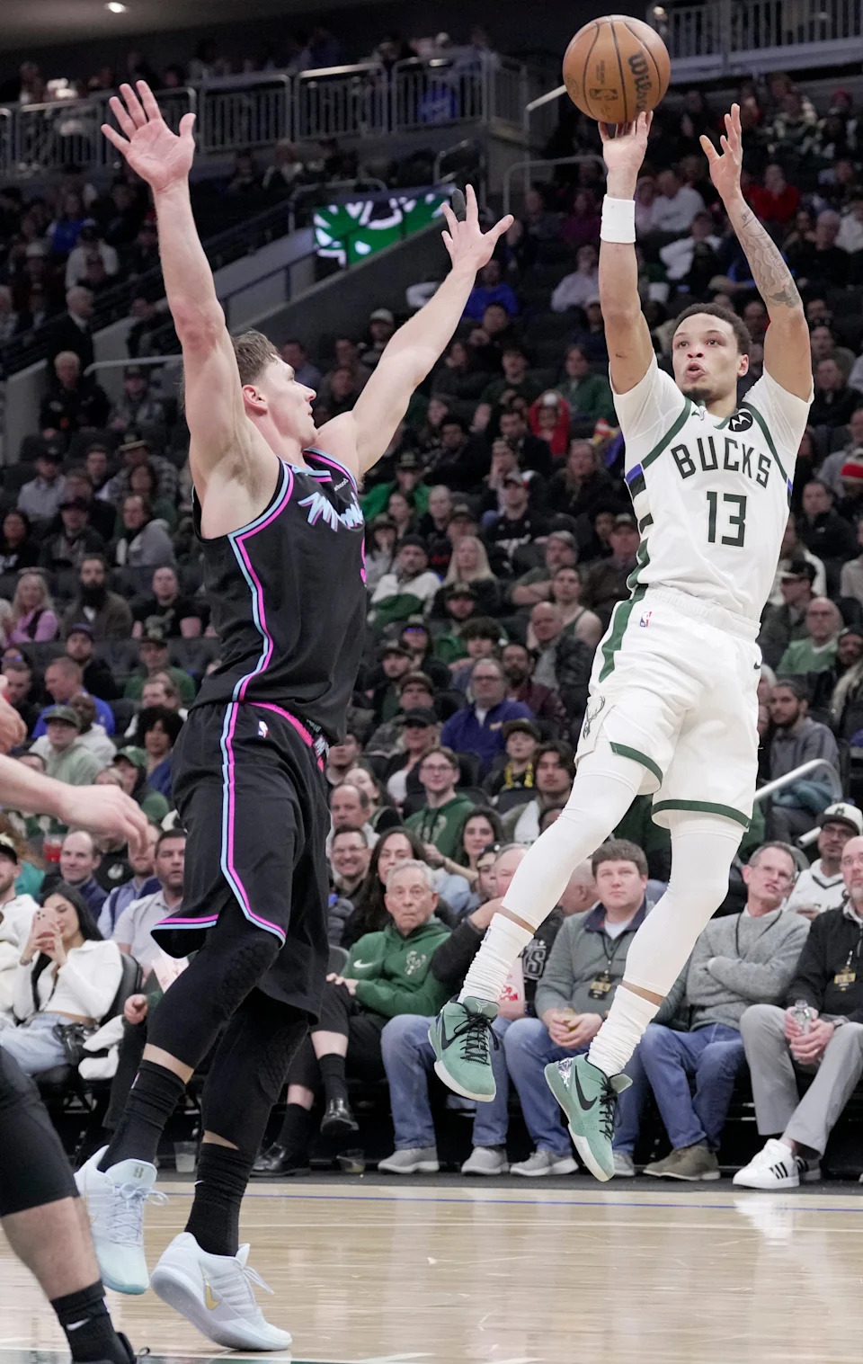 Milwaukee Bucks guard Ryan Rollins (13) shoots over Miami Heat guard Pelle Larsson (9) during the second half of their game Tuesday, February 24, 2026 at Fiserv Forum in Milwaukee, Wisconsin. The Milwaukee Bucks beat the Miami Heat 128-117.