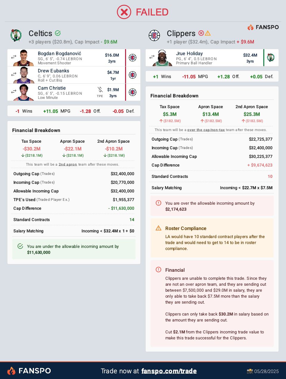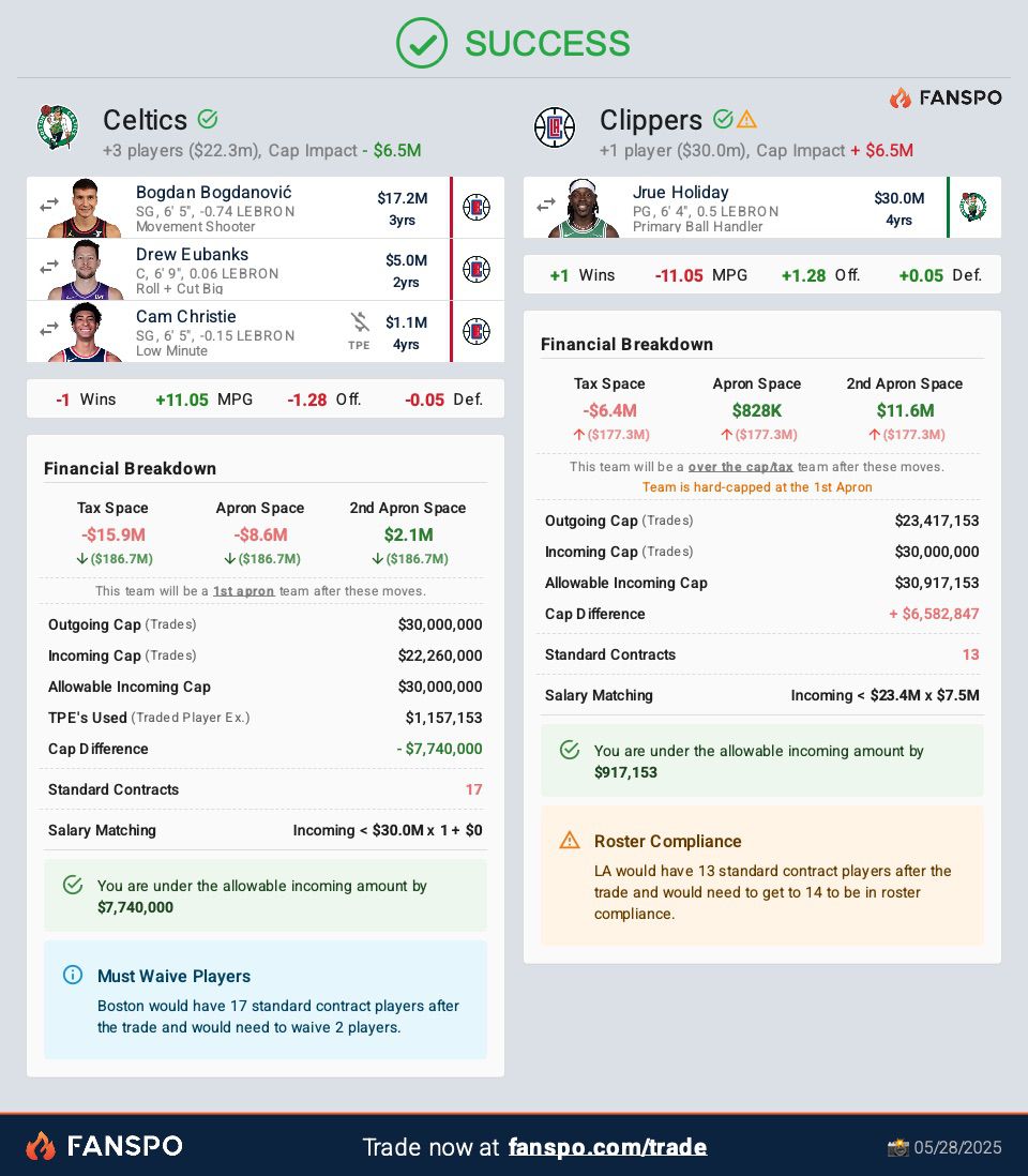 Any deal that involves the Clippers would see the Celtics likely take Bogdan Bogdanovic, his $16 million salary. If Boston and Los Angeles can complete the trade before the calendar turns to July and the new league year begins the deal Robb mentioned in his story of Holiday for Bogdanovic, Drew Eubanks and one of Jordan Miller, Kobe Brown or Cam Christie, brother of Mavericks guard Max Christie, works.