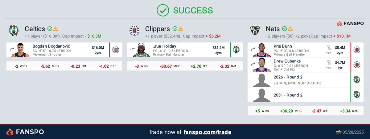 If the teams decide to wait because the Clippers would rather move Dunn that one of their young guys, Boston would likely flip both Dunn and Eubanks in that trade so using the Nets’ cap space. As a result, it could look like this.