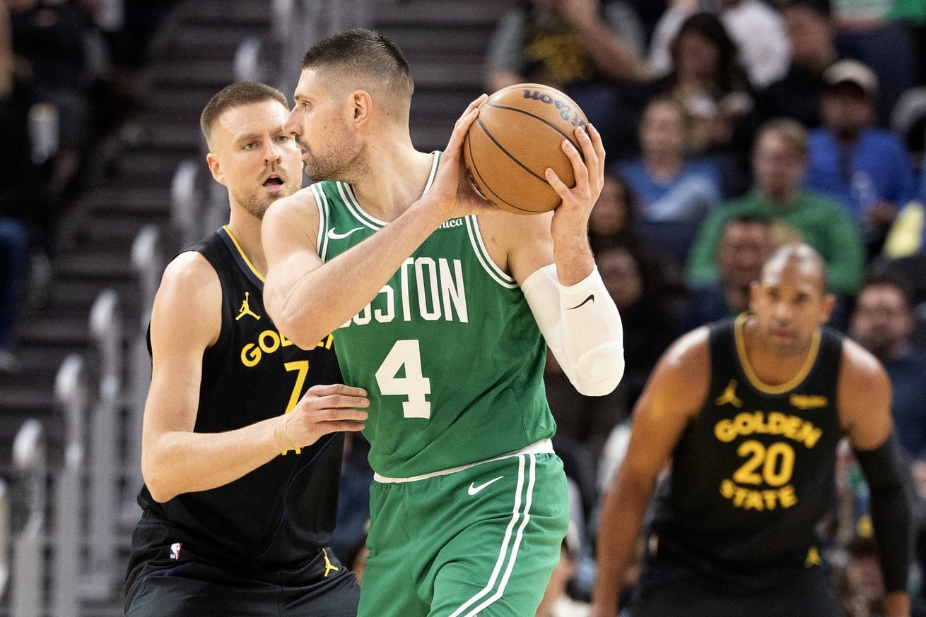 Feb 19, 2026; San Francisco, California, USA; Golden State Warriors center Kristaps Porzingis (7) guards Boston Celtics center Nikola Vucevic (4) during the third quarter at Chase Center. Mandatory Credit: D. Ross Cameron-Imagn Images