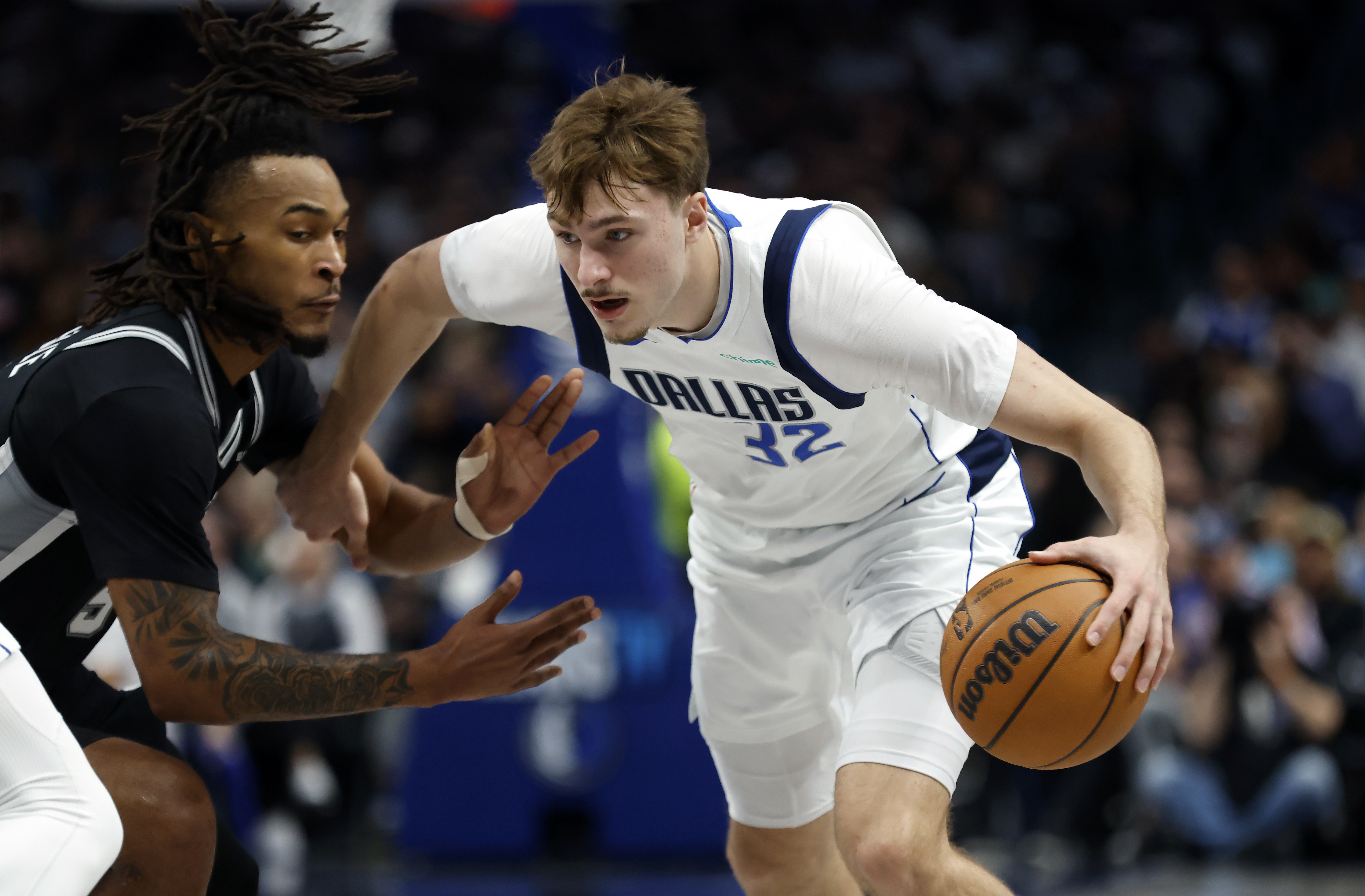 GettyDALLAS, TEXAS – FEBRUARY 5: Cooper Flagg #32 of the Dallas Mavericks handles the ball as Stephon Castle #5 of the San Antonio Spurs defends during the first half at American Airlines Center on February 5, 2026 in Dallas, Texas. (Photo by Ron Jenkins/Getty Images)