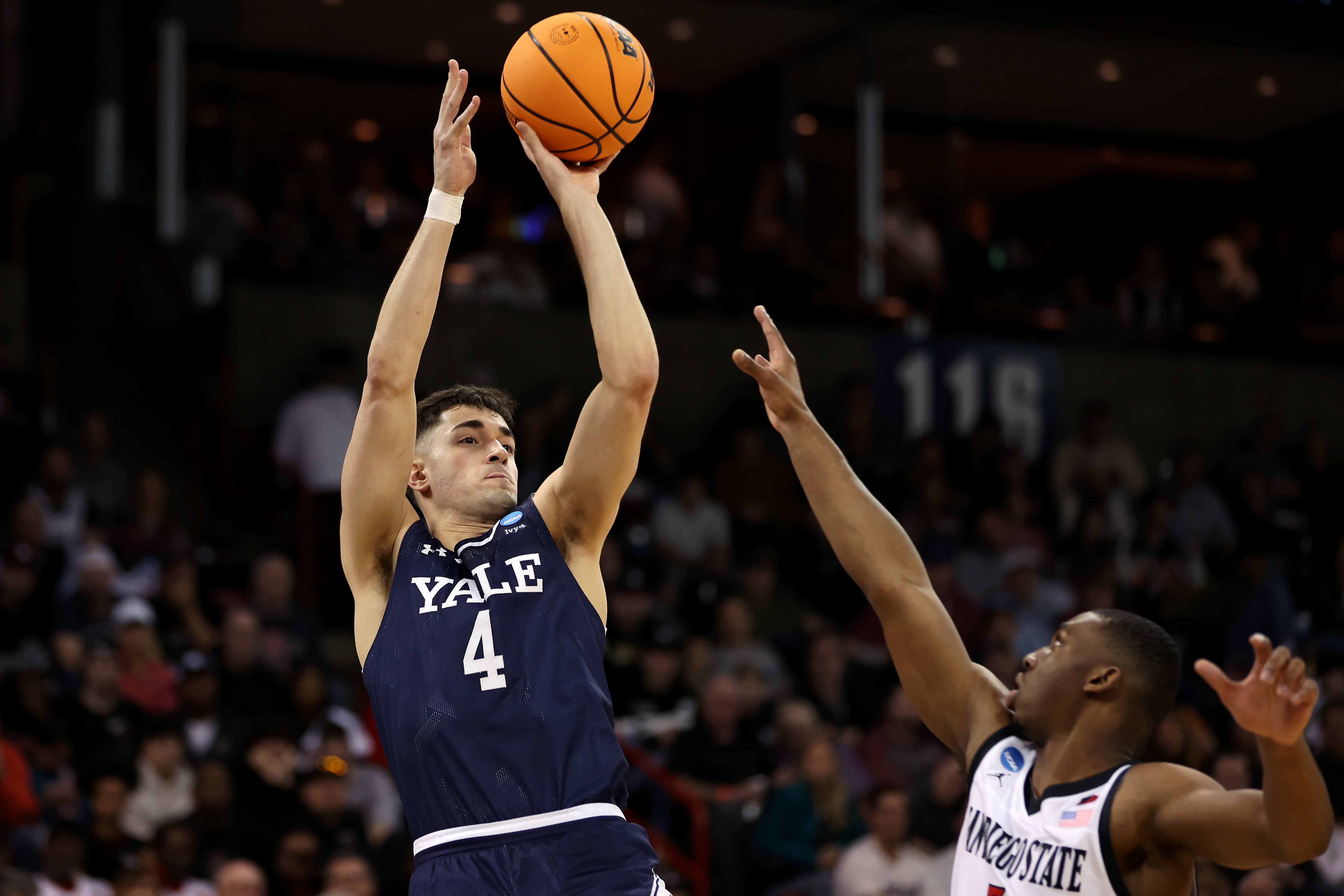 GettySPOKANE, WASHINGTON – MARCH 24: John Poulakidas #4 of the Yale Bulldogs shoots the ball against Lamont Butler #5 of the San Diego State Aztecs during the first half in the second round of the NCAA Men’s Basketball Tournament at Spokane Veterans Memorial Arena on March 24, 2024 in Spokane, Washington. (Photo by Steph Chambers/Getty Images)