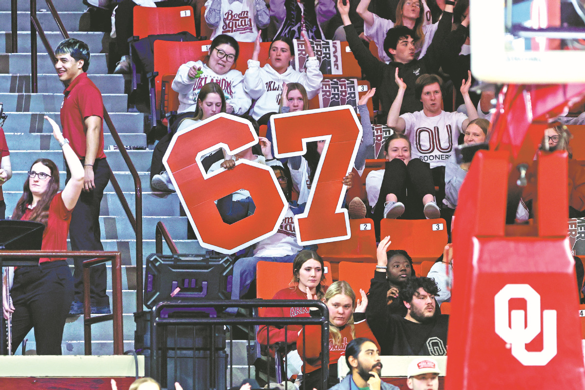 Fans have been on 67-point watch at games across the country. It seemed to bubble up first at women’s college games, including at Oklahoma. Now, fans there hold up signs handed out by the school.