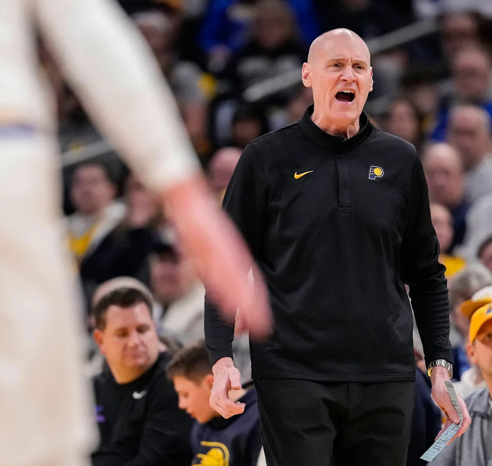 Indiana Pacers head coach Rick Carlisle yells to players on the court Sunday, March 1, 2026, during the game at Gainbridge Fieldhouse in Indianapolis.