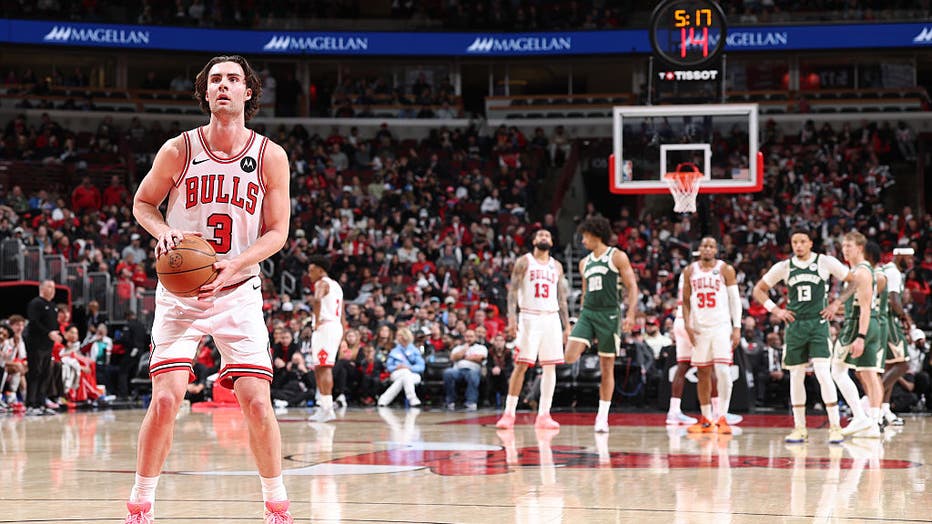 CHICAGO, IL – MARCH 1: Josh Giddey #3 of the Chicago Bulls shoots a free throw during the game against the Milwaukee Bucks on March 1, 2026 at United Center in Chicago, Illinois. NOTE TO USER: User expressly acknowledges and agrees that, by downloadi