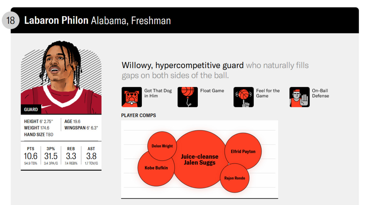 The Ringer ranks Philon as the 18th overall prospect, drawing player comps to Jalen Suggs, Delon Wright, Rajon Rondo, and Elfrid Payton.