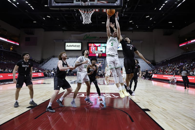 Utah Valley’s Tanner Toolson (5) drives to the basket during the Wolverines’ 68-55 win over Seattle in the WAC men’s basketball tournament semifinals at Orleans Arena in Las Vegas on Friday, March 14, 2025. | Jay Drowns, UVU Marketing