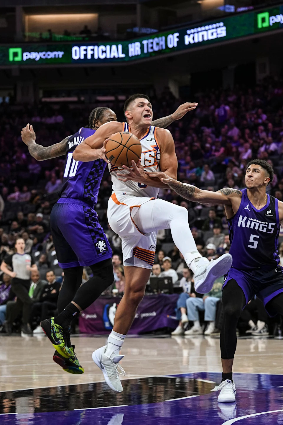 Phoenix Suns guard Grayson Allen (8) is fouled by Sacramento Kings guard DeMar DeRozan (10) during the second quarter at Golden 1 Center on March 3, 2026.