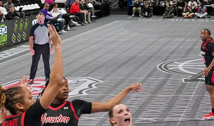 BYU’s Braeden Gunlock, right, and Laura Rohkohl battle for a rebound with a pair of Houston players during a first-round game at the Big 12 women’s basketball tournament at the T-Mobile Center in Kansas City on Wednesday, March 4, 2026.