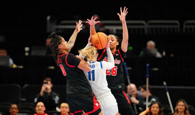 BYU guard Delaney Gibb (11) tries to split the defense of Houston’s TK Pitts (0) and Jorynn Ross during a first-round game at the Big 12 women’s basketball tournament at the T-Mobile Center in Kansas City on Wednesday, March 4, 2026. | Denny Medley/Big 12 Conference