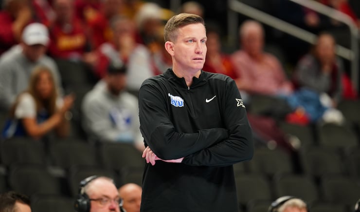 BYU head coach Lee Cummard looks on in his team’s game against Houston during a first-round game at the Big 12 women’s basketball tournament at the T-Mobile Center in Kansas City on Wednesday, March 4, 2026. | Denny Medley/Big 12 Conference