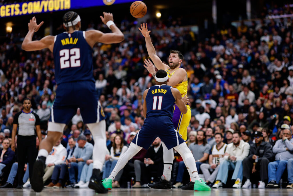 Jan 20, 2026; Denver, Colorado, USA; Los Angeles Lakers guard Luka Doncic (77) passes the ball against Denver Nuggets guard Bruce Brown (11) as forward Zeke Nnaji (22) defends in the fourth quarter at Ball Arena. Mandatory Credit: Isaiah J. Downing-Imagn Images