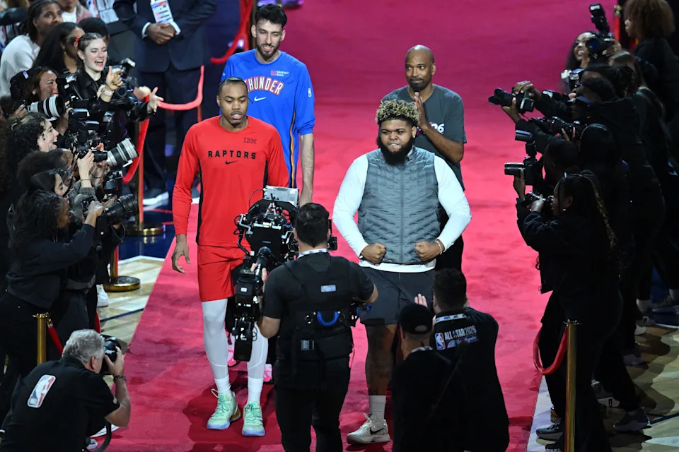 Feb 14, 2026; Los Angeles, CA, USA; Team All-Star center Chet Holmgren (7) of the Oklahoma City Thunder and forward Scottie Barnes (4) of the Toronto Raptors and Team All-Star NBA legend Richard Hamilton and actor Druski are introduced before the shooting stars competition during the 2026 NBA All Star Saturday Night at Intuit Dome. Mandatory Credit: William Liang-Imagn Images