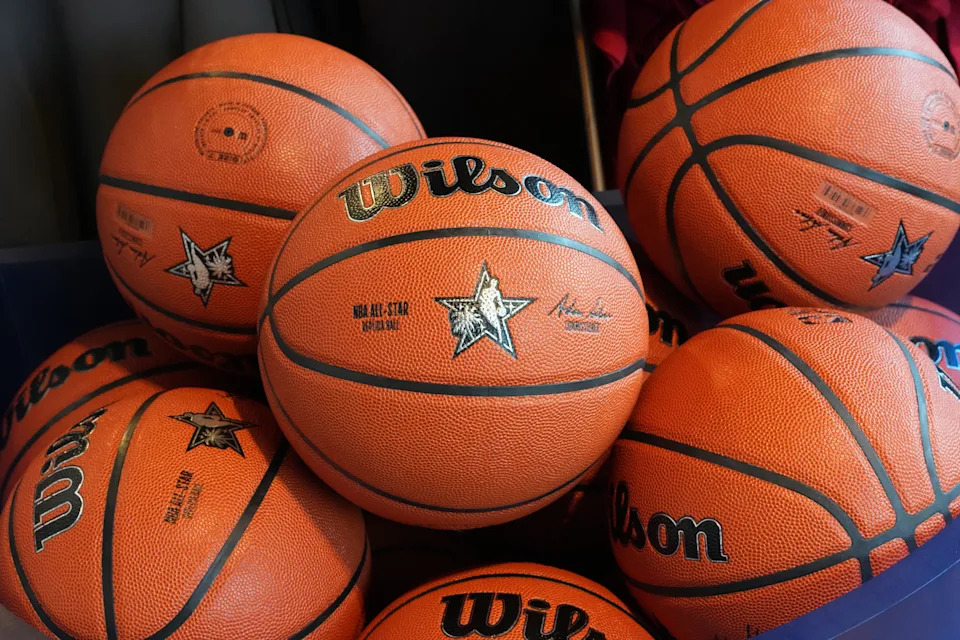 Feb 12, 2026; Inglewood, California, USA; Wilson official NBA All Star 2026 logo basketballs at the Intuit Dome. Mandatory Credit: Kirby Lee-Imagn Images