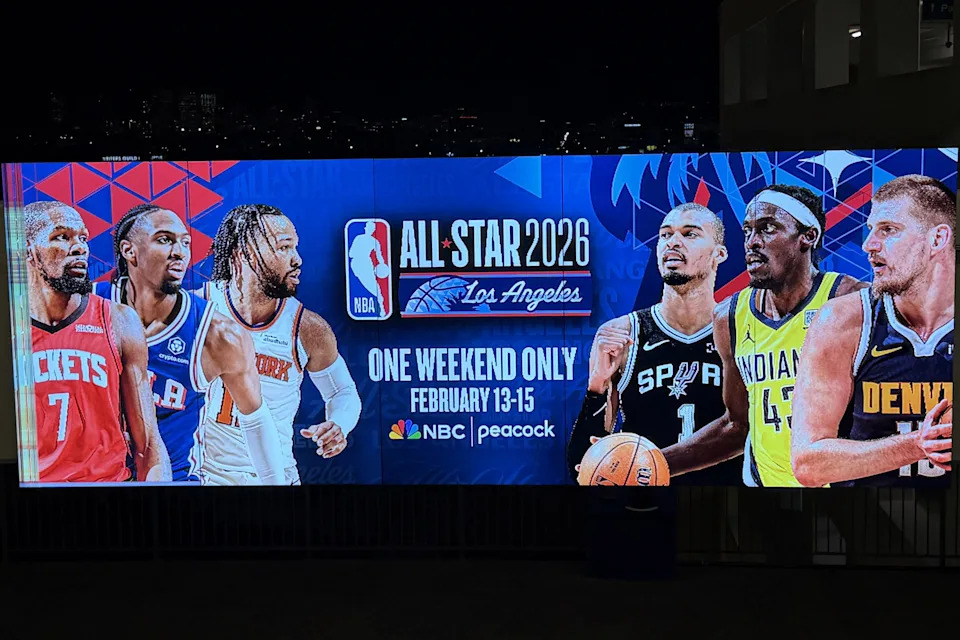 Feb 12, 2026; Los Angeles, California, USA; A NBA Peacock advertisement for the NBA All 2026 at The Grove. Mandatory Credit: Kirby Lee-Imagn Images