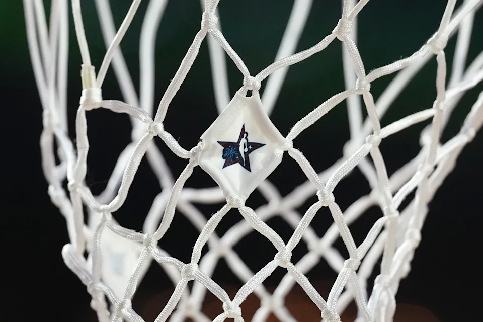Feb 13, 2026; Inglewood, California, USA; Detail view of the logo on the net before an NBA All Star Rising Stars game at Intuit Dome. Mandatory Credit: Kirby Lee-Imagn Images