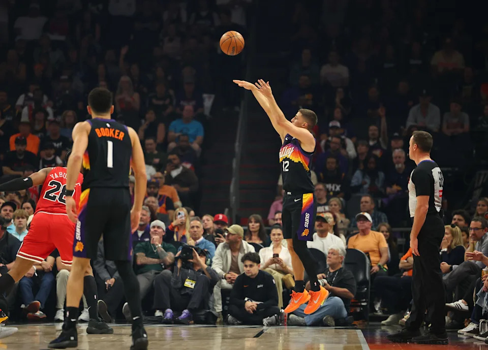Phoenix Suns guard Collin Gillespie (12) attempts a 3 point shot against the Chicago Bulls during the first quarter at Mortgage Matchup Center in Phoenix, on March 5, 2026.