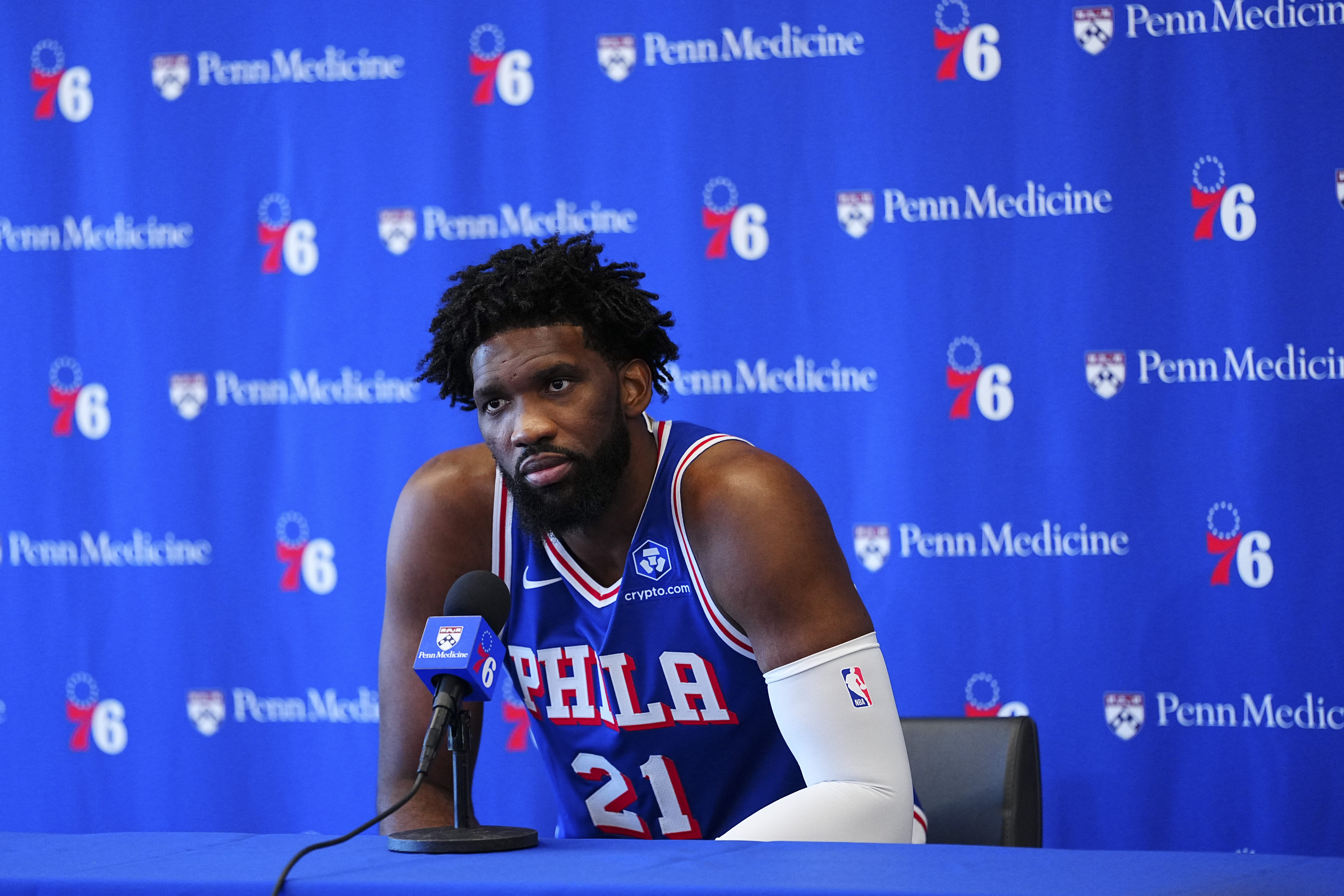 CAMDEN, NEW JERSEY – SEPTEMBER 26: Joel Embiid #21 of the Philadelphia 76ers participates in media day at 76ers Training Complex on September 26, 2025 in Camden, New Jersey. NOTE TO USER: User expressly acknowledges and agrees that, by downloading and or using this photograph, User is consenting to the terms and conditions of the Getty Images License Agreement. (Photo by Mitchell Leff/Getty Images)
