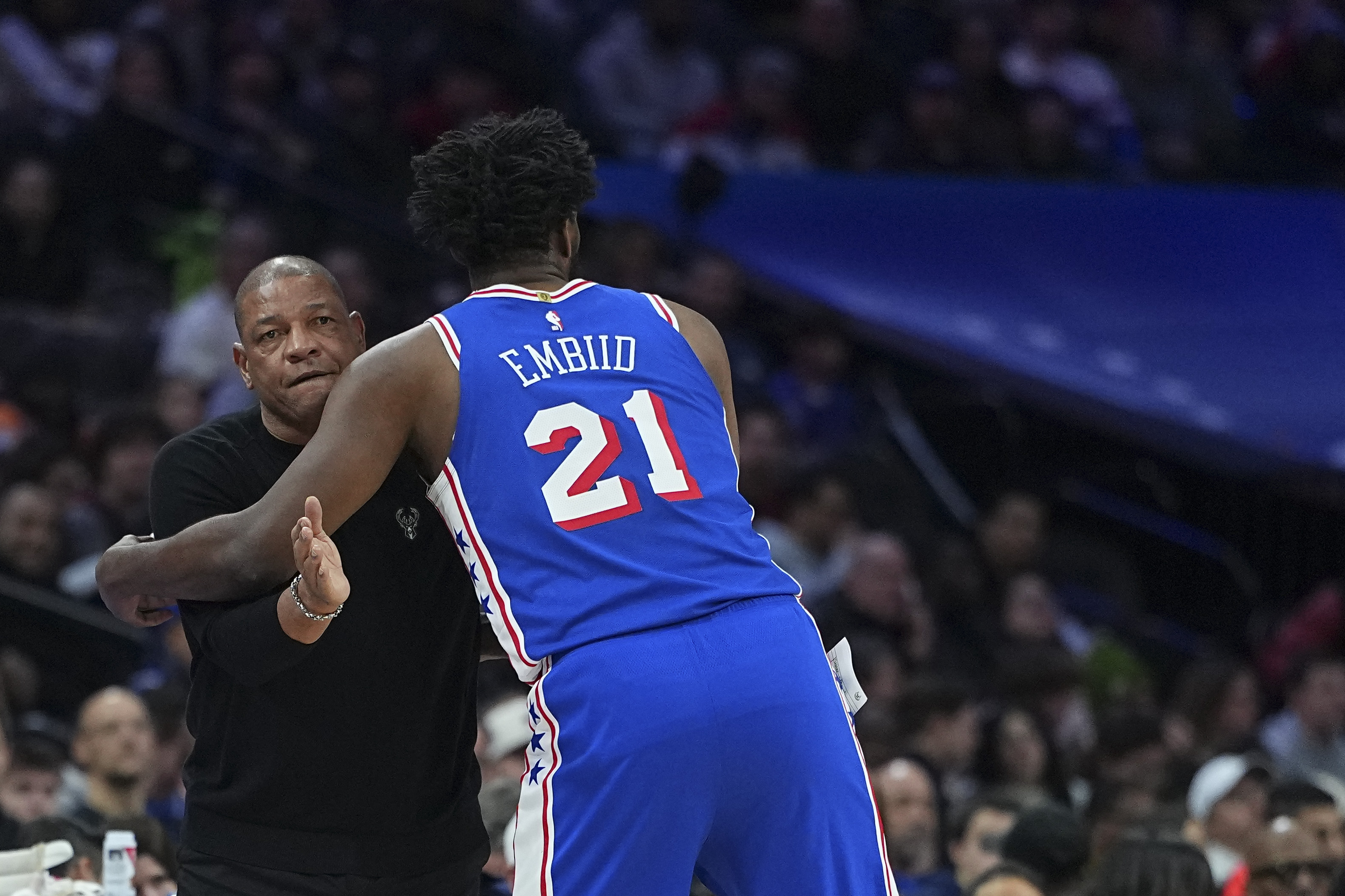 GettyPHILADELPHIA, PENNSYLVANIA – JANUARY 27: Head coach Doc Rivers of the Milwaukee Bucks and Joel Embiid #21 of the Philadelphia 76ers embrace in the first quarter at Xfinity Mobile Arena on January 27, 2026 in Philadelphia, Pennsylvania. (Photo by Mitchell Leff/Getty Images)