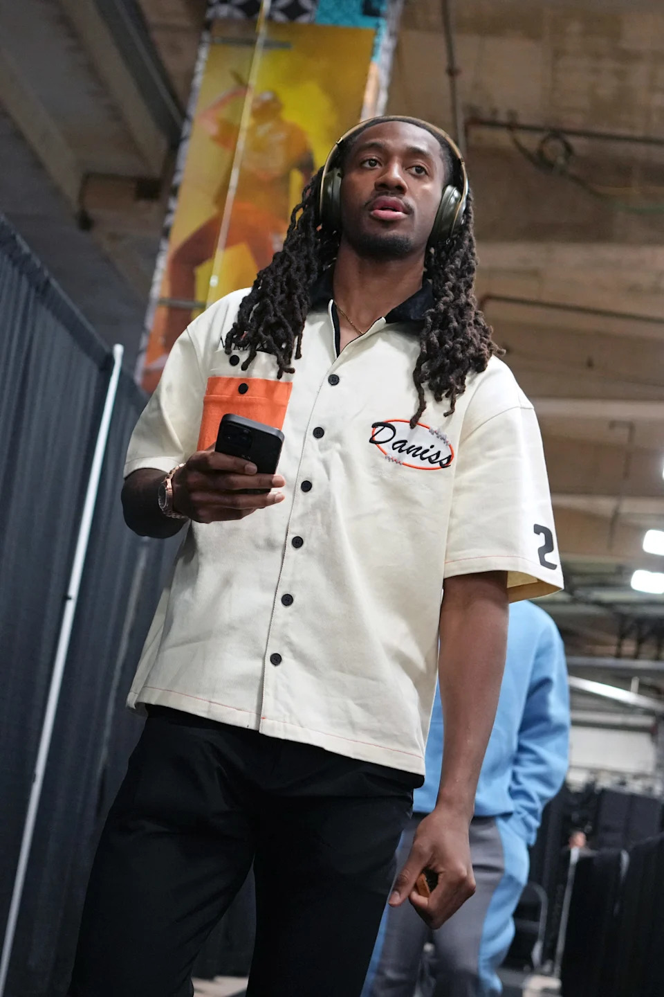 Detroit Pistons guard Daniss Jenkins (24) enters Frost Bank Center before a game against the San Antonio Spurs at Frost Bank Center in San Antonio on Thursday, March 5, 2026.