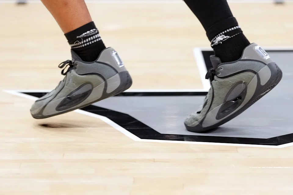 Detailed view of the shoes worn by San Antonio Spurs guard Stephon Castle (5) before a game against the San Antonio Spurs at Frost Bank Center in San Antonio on Thursday, March 5, 2026.