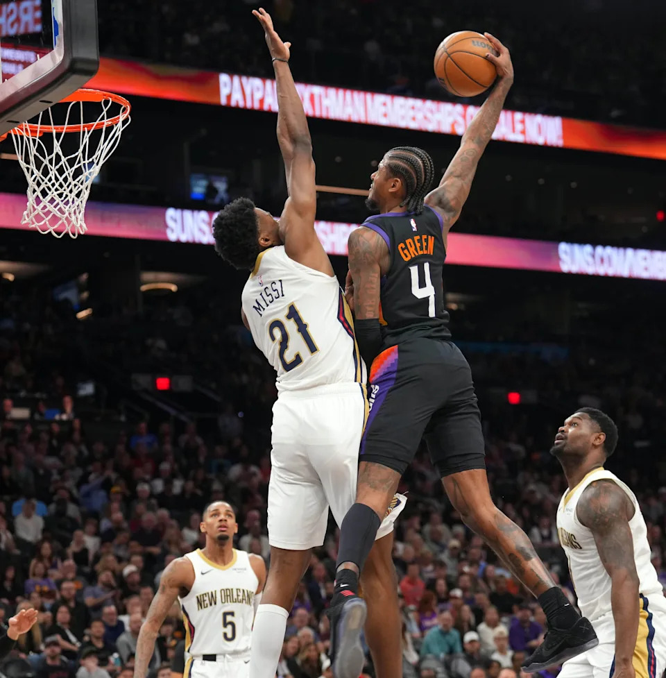 Phoenix Suns guard Jalen Green (4) attempts a dunk over New Orleans Pelicans center Yves Missi (21) during the first half at Mortgage Matchup Center in Phoenix, on March 6, 2026.
