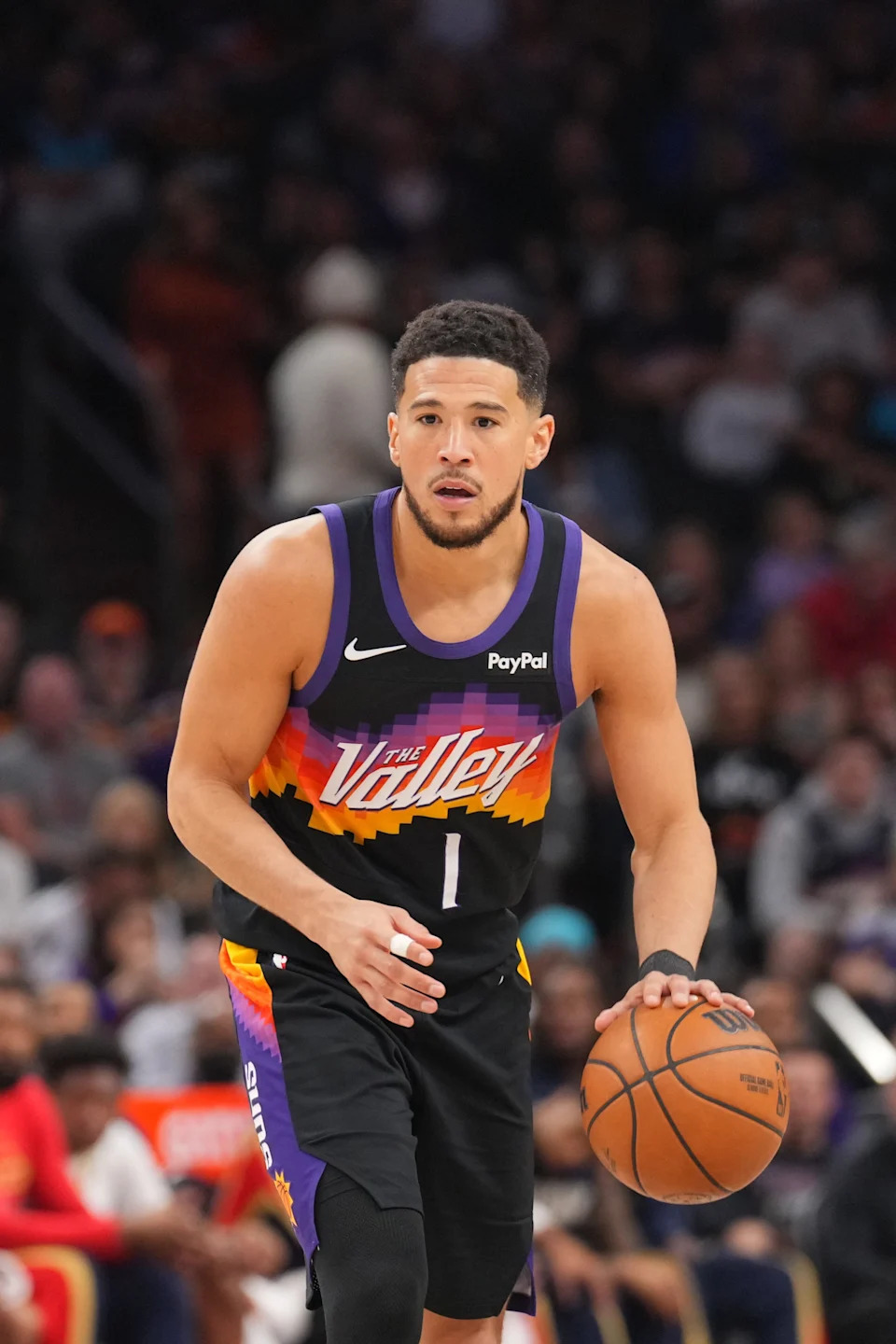 Phoenix Suns guard Devin Booker (1) dribbles against the New Orleans Pelicans during the first half at Mortgage Matchup Center in Phoenix, on March 6, 2026.