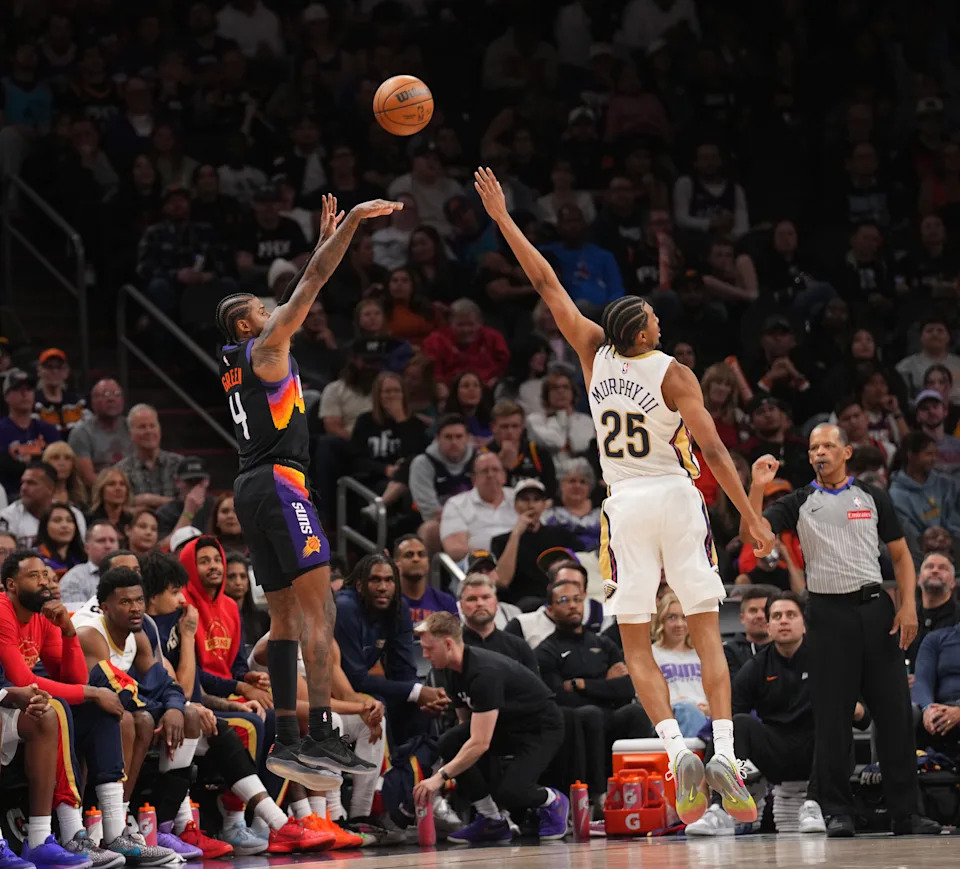 Phoenix Suns guard Jalen Green (4) shoots over New Orleans Pelicans forward Trey Murphy III (25) during the first half at Mortgage Matchup Center in Phoenix, on March 6, 2026.