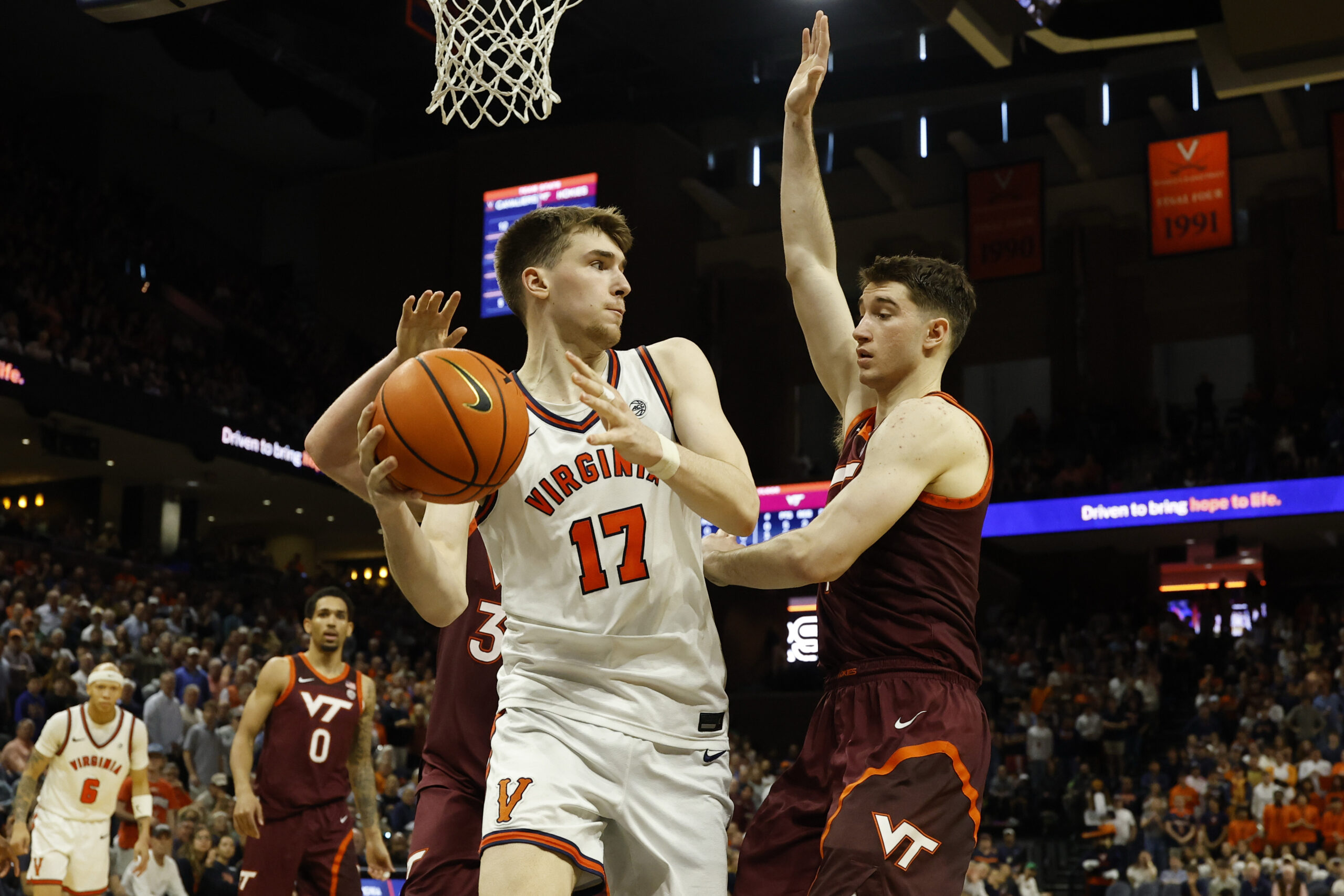 Mar 7, 2026; Charlottesville, Virginia, USA; Virginia Cavaliers center Johann Grünloh (17) passes the ball s Virginia Tech Hokies guard Neoklis Avdalas (17) defends in the second half at John Paul Jones Arena. Mandatory Credit: Geoff Burke-Imagn Images
