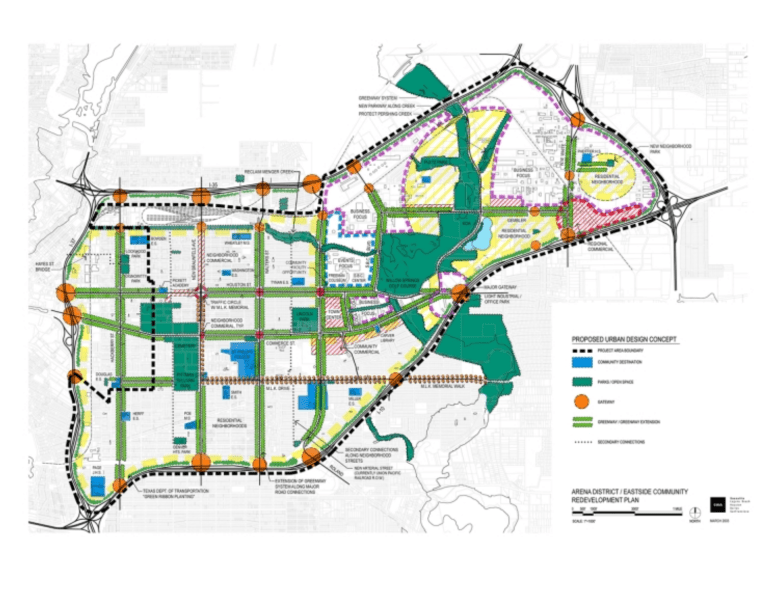 However, the city, county and Spurs worked with a nonprofit economic development group called the Community Economic Revitalization Agency (CERA) to fund and create the 156-page Arena District Community Development Plan — which later became known as the Arena District/Eastside Community Plan.
