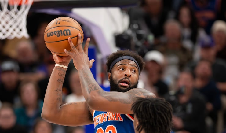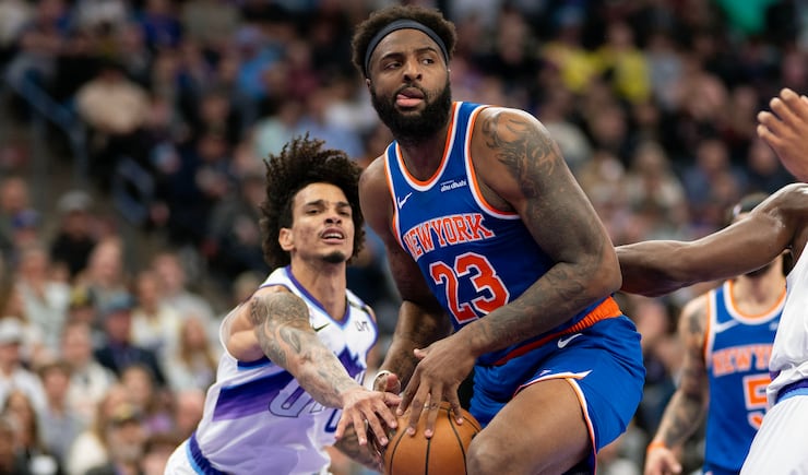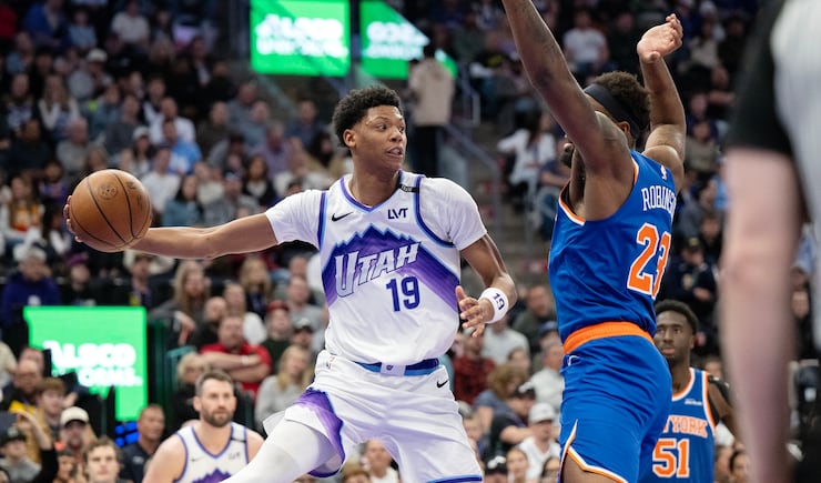 New York Knicks center Mitchell Robinson (23) looks to pass with Utah Jazz guard Isaiah Collier (8) defending as the Jazz and Knicks play at the Delta Center in Salt Lake City, on Wednesday, March 11, 2026. | Scott G Winterton, Deseret News