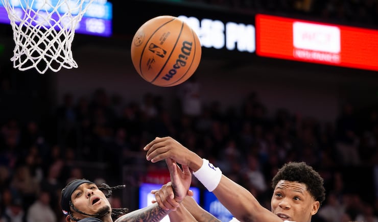 New York Knicks guard Jordan Clarkson (00) and Utah Jazz guard Ace Bailey (19) battle for the rebound as the Jazz and Knicks play at the Delta Center in Salt Lake City, on Wednesday, March 11, 2026. | Scott G Winterton, Deseret News