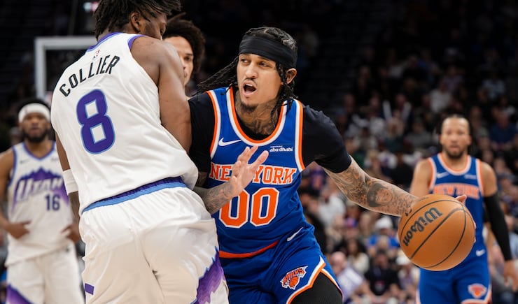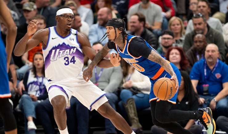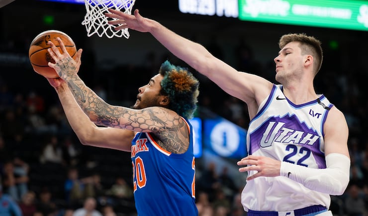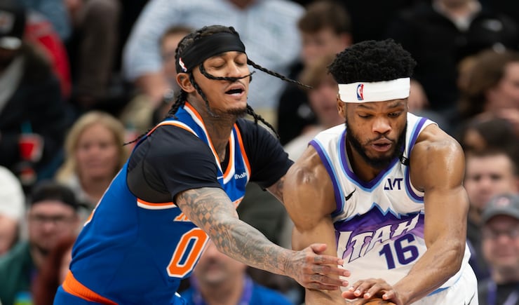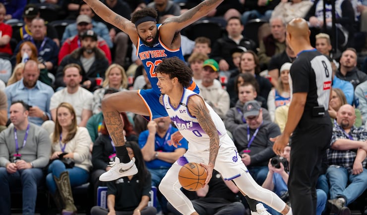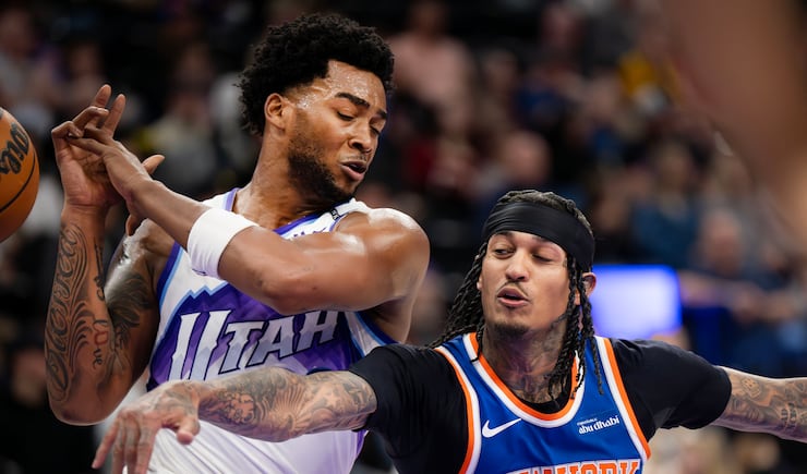New York Knicks guard Jordan Clarkson (00) takes the ball back up around Utah Jazz guard Isaiah Collier (8) as the Jazz and Knicks play at the Delta Center in Salt Lake City, on Wednesday, March 11, 2026. | Scott G Winterton, Deseret News