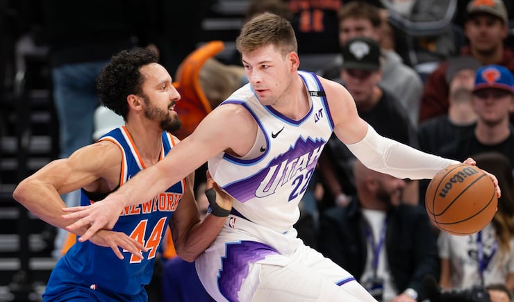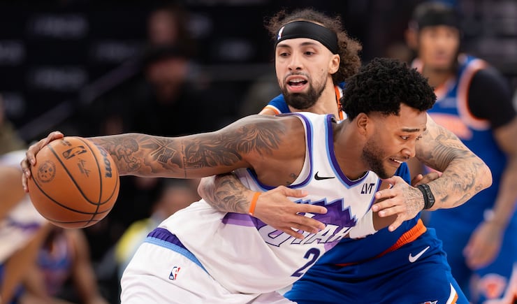 Utah Jazz forward Brice Sensabaugh (28) works against New York Knicks guard Jose Alvarado (5) as the Jazz and Knicks play at the Delta Center in Salt Lake City, on Wednesday, March 11, 2026. | Scott G Winterton, Deseret News