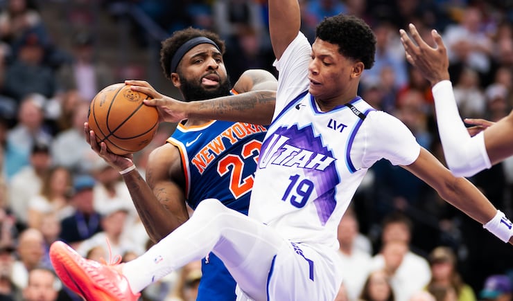 Utah Jazz guard Ace Bailey (19) looks for help as he is guarded by New York Knicks center Mitchell Robinson (23) as the Jazz and Knicks play at the Delta Center in Salt Lake City, on Wednesday, March 11, 2026. | Scott G Winterton, Deseret News