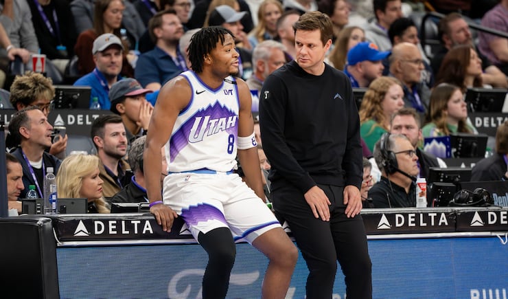 Utah Jazz guard Isaiah Collier (8) and Utah Jazz head coach Will Hardy talk at the scorers table as the Jazz and Knicks play at the Delta Center in Salt Lake City, on Wednesday, March 11, 2026. | Scott G Winterton, Deseret News