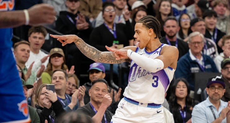 After draining a three point shot, Utah Jazz guard Keyonte George (3) gestures back toward the bench as the Jazz and Knicks play at the Delta Center in Salt Lake City, on Wednesday, March 11, 2026. | Scott G Winterton, Deseret News