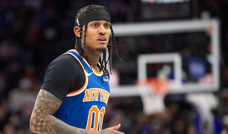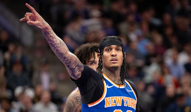 Former Jazzman New York Knicks guard Jordan Clarkson (00) walks back onto the court after a timeout as the Jazz and Knicks play at the Delta Center in Salt Lake City, on Wednesday, March 11, 2026. | Scott G Winterton, Deseret News