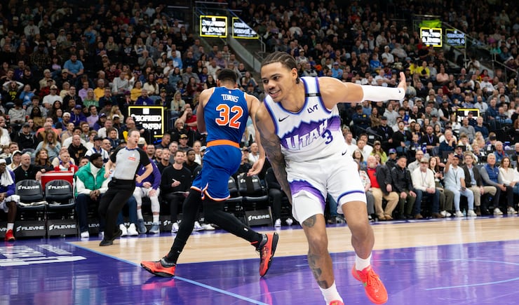 Utah Jazz guard Keyonte George (3) grabs at his hamstring and heads directly into the locker room after trying to defend New York Knicks center Karl-Anthony Towns (32) on a breakaway as the Jazz and Knicks play at the Delta Center in Salt Lake City, on Wednesday, March 11, 2026. | Scott G Winterton, Deseret News