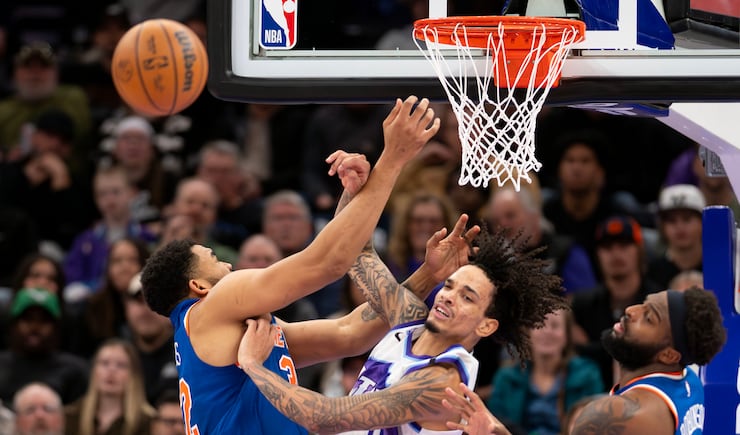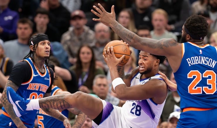 Utah Jazz forward Brice Sensabaugh (28) grabs a rebound between New York Knicks guard Jordan Clarkson (00) and New York Knicks center Mitchell Robinson (23) as the Jazz and Knicks play at the Delta Center in Salt Lake City, on Wednesday, March 11, 2026. | Scott G Winterton, Deseret News
