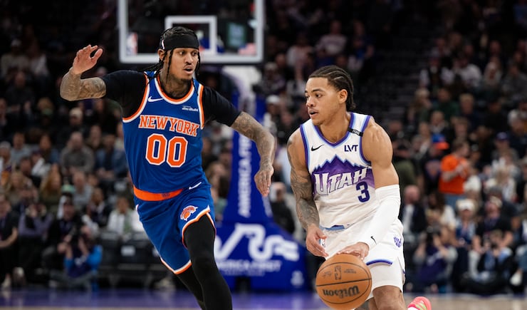 Former Jazzman New York Knicks guard Jordan Clarkson (00) guards Utah Jazz guard Keyonte George (3) as the Jazz and Knicks play at the Delta Center in Salt Lake City, on Wednesday, March 11, 2026. | Scott G Winterton, Deseret News