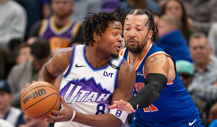 Utah Jazz guard Isaiah Collier (8) is guarded by New York Knicks guard Jalen Brunson (11) as the Jazz and Knicks play at the Delta Center in Salt Lake City, on Wednesday, March 11, 2026. | Scott G Winterton, Deseret News