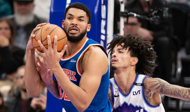Utah Jazz forward Andersson Garcia (0) tries to knock the ball away from New York Knicks center Karl-Anthony Towns (32) as the Jazz and Knicks play at the Delta Center in Salt Lake City, on Wednesday, March 11, 2026. | Scott G Winterton, Deseret News