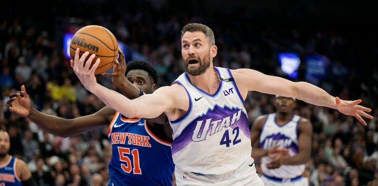 New York Knicks forward Mohamed Diawara (51) and Utah Jazz forward Kevin Love (42) grapple for the ball as the Jazz and Knicks play at the Delta Center in Salt Lake City, on Wednesday, March 11, 2026. | Scott G Winterton, Deseret News