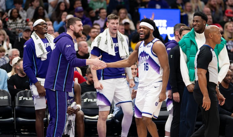 Utah Jazz forward Brice Sensabaugh (28) celeberates hitting a three point shot as the Jazz and Knicks play at the Delta Center in Salt Lake City, on Wednesday, March 11, 2026. | Scott G Winterton, Deseret News