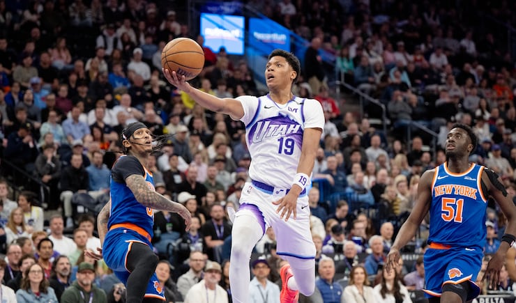 Utah Jazz guard Ace Bailey (19) takes the ball to the hoop as former Jazzman New York Knicks guard Jordan Clarkson (00) looks on as the Jazz and Knicks play at the Delta Center in Salt Lake City, on Wednesday, March 11, 2026. | Scott G Winterton, Deseret News