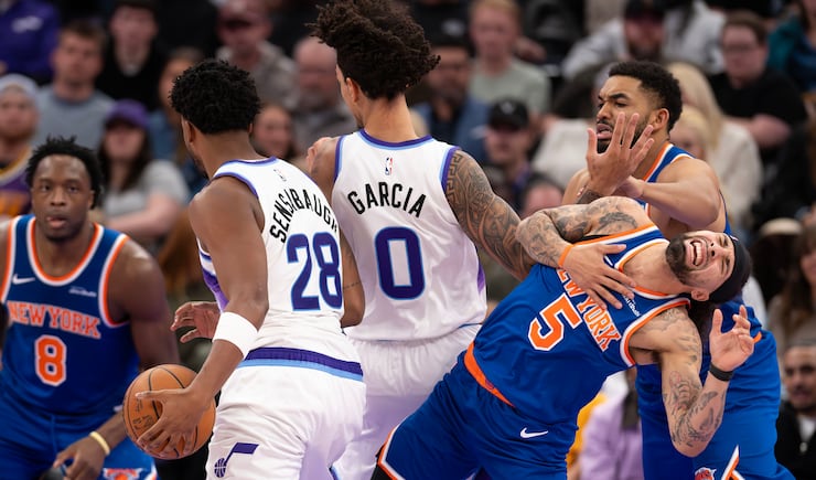 New York Knicks guard Jose Alvarado (5) tries to draw a call on Utah Jazz forward Brice Sensabaugh (28) as the Jazz and Knicks play at the Delta Center in Salt Lake City, on Wednesday, March 11, 2026. | Scott G Winterton, Deseret News