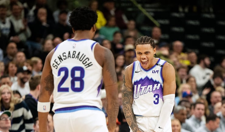 After draining a three point shot, Utah Jazz guard Keyonte George (3) celebrates with teammate Utah Jazz forward Brice Sensabaugh (28) as the Jazz and Knicks play at the Delta Center in Salt Lake City, on Wednesday, March 11, 2026. | Scott G Winterton, Deseret News