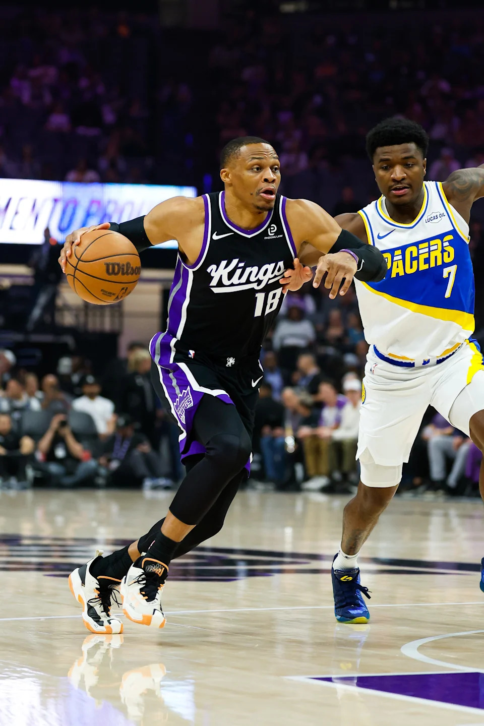 Mar 10, 2026; Sacramento, California, USA; Sacramento Kings guard Russell Westbrook (18) drives to the basket against Indiana Pacers guard Kam Jones (7) during the first quarter at Golden 1 Center. Mandatory Credit: Sergio Estrada-Imagn Images